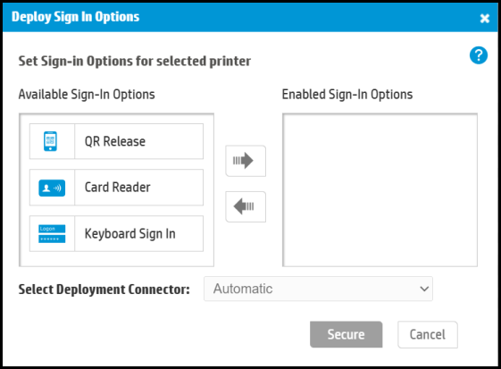- In the Secure Printers for Printer Sign In Options section of the Setup Guide, click the Secure button. This opens the Secure Printers dialog box.