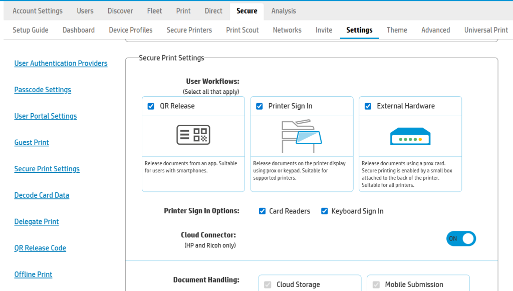 Navigate to the Secure > Settings > Secure Print Settings screen to configure how users release their documents from a secure printer. For Secure Print Cloud Connector, the options are: