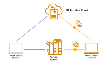 Cloud Storage & Crowdsourcing - Print submission will store a print job locally and in the HP Insights. Print release will use the employee’s personal Print Scout if online otherwise will use cloud backup and an available crowdsource Print Scout.