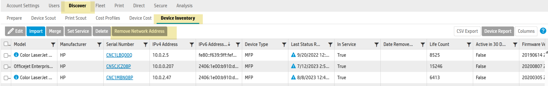 - Added a new Remove Network Address button to the Discover > Device Inventory screen. This allows IT admins to remove outdated network addresses (such as hostnames or IP addresses) associated with a device. This is useful when transitioning from an IPv4 network to an IPv6-only configuration or for cleaning up the system of outdated information.