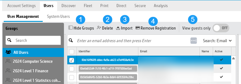 Note: When a user is deleted from the User Management tab, the user record is removed from the user identity database but remain in the Print Analytics database.