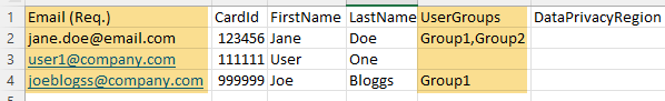 Each line in the CSV file includes the following comma-separated fields: EmailAddress, CardID, FirstName, LastName, UseGroups, and DataPrivacyRegion as shown in the example below. For user group import, Email and UserGroups or Email and DataPrivacyRegion are required fields.