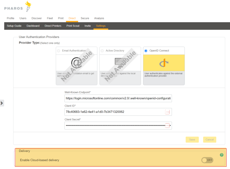 To enable Off-network Direct IP printing through the cloud, toggle the option Enable Cloud-based delivery setting in the Delivery section of the Direct > Settings tab. When Cloud-based delivery is enabled, print jobs will be routed through the cloud if there is no direct connection to the target printer and will be immediately sent to the designated printer.