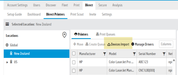 1. In the Direct > Direct Printers > Printers tab, select Devices Import.